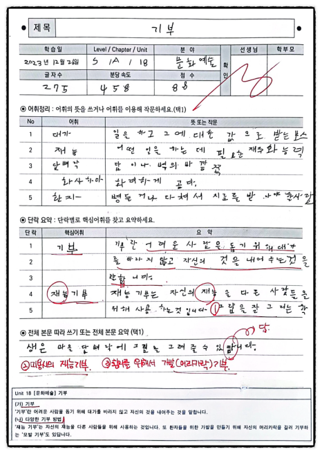 우리 학원의 국어 학습은 매일매일 글을 읽고 요약하는 습관을 길러주는 것입니다.